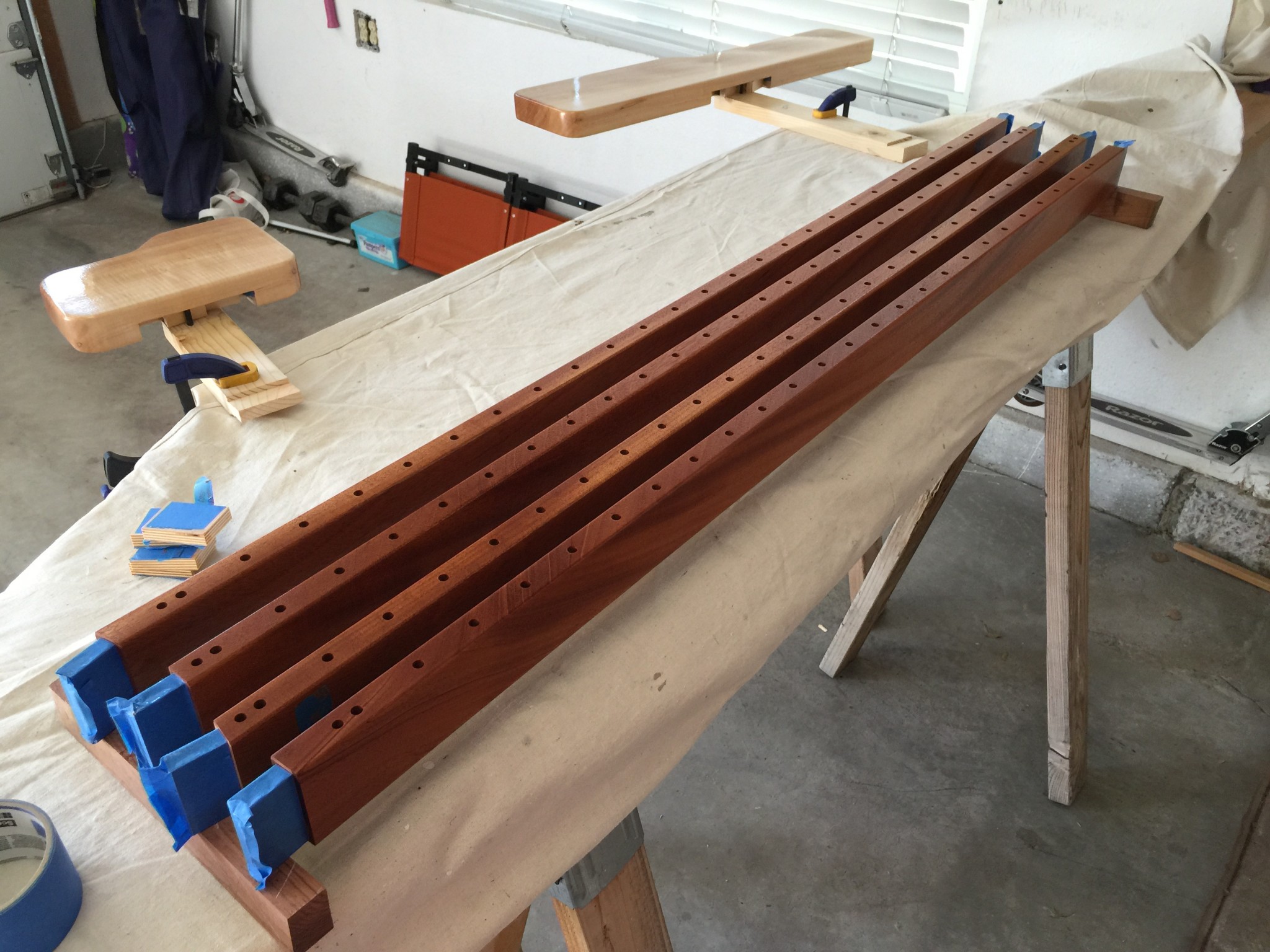 I chose lacquer for the frame finish. I like lacquer because it really brings out the depth in the wood but also because it drys quickly, so it is fast to build up a finish. We decided to finish the rails and end pieces prior to assembly for a few reasons. First, down at the right end of the instrument, the spacing is a little tight, so it is hard to spray finish in there. Second, there is inevitably glue squeeze out at the joints, and it is often hard to remove all of that glue prior to finishing. Any glue left behind will keep the wood from absorbing the finish which leaves unsightly “splotches.” So we put blue painters tape over the mortises and tenons and sprayed the parts with an HVLP gun. (I use a cheap $100 HVLP system from Rocker for the finish. For the price, this thing is actually pretty decent.) Here are a few photos: