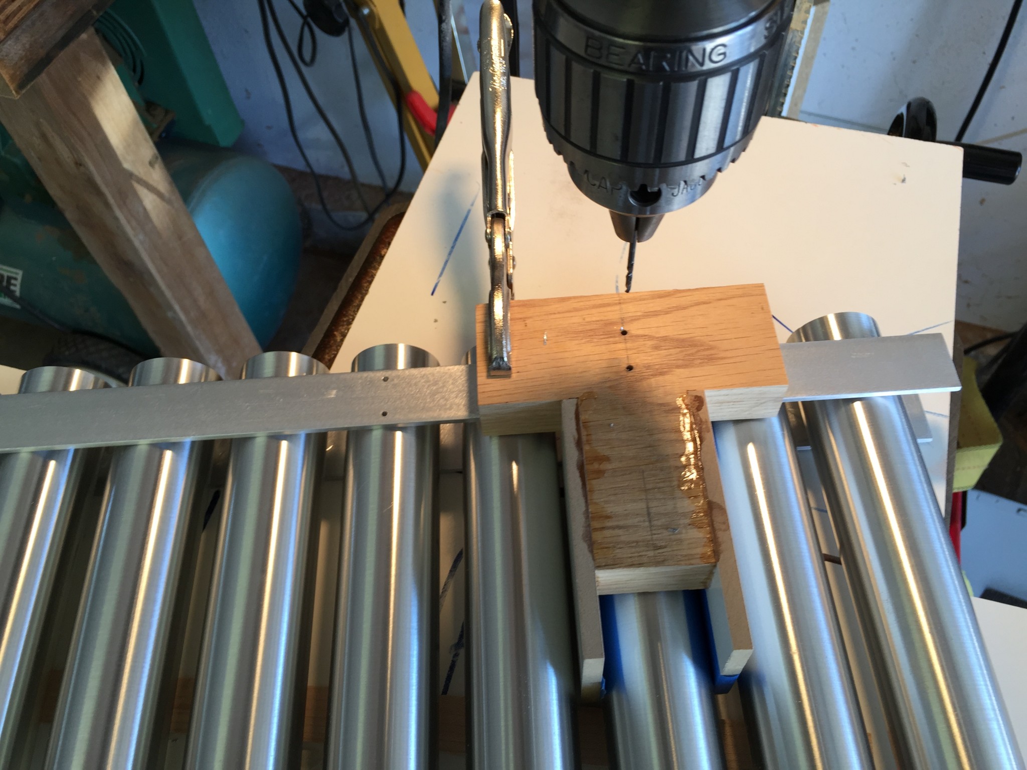 The jig was just a little T-shape of wood with wings that straddled each bar. It had two holes in it to guide the drill for each pair of holes. This made drilling the holes pretty speedy even though there were a lot of them. The drill I used was for the 4-40 threads. After these holes were drilled, I put in a body drill and just drilled 1/8th of an inch, which was the thickness of the rail. This ensured that the screws pulled up tight to the tube.