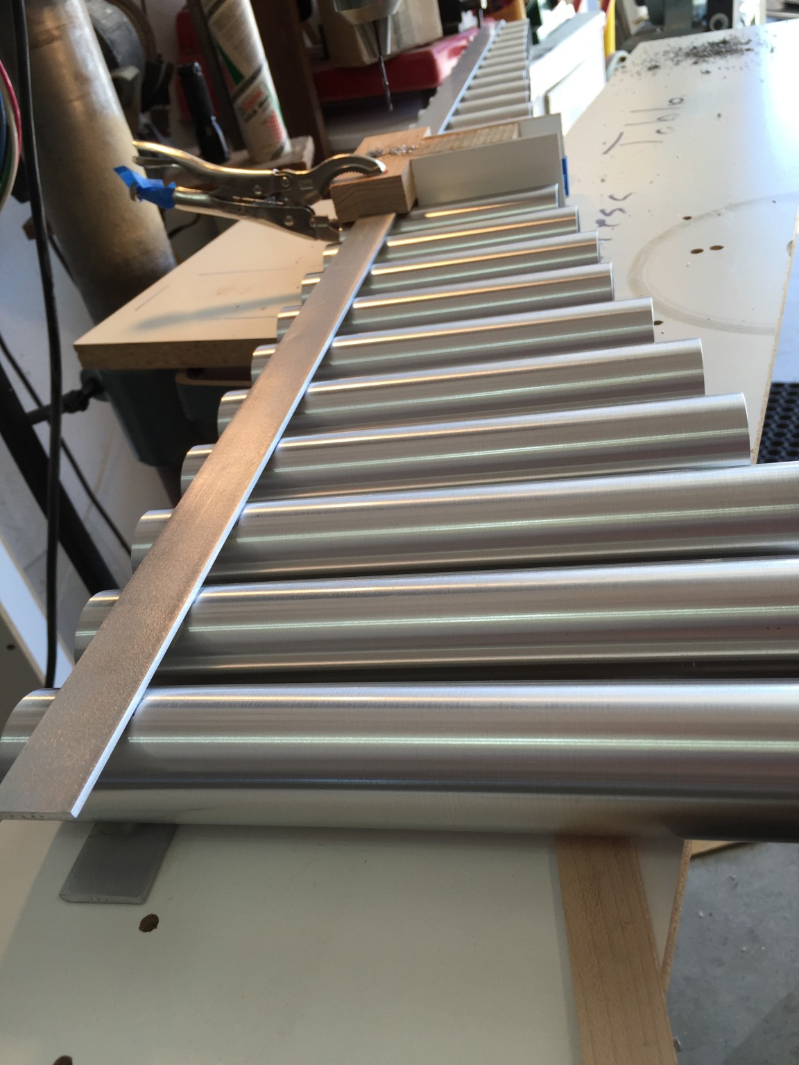 With the mandrel inserted, brushing the aluminum was easy. I just spun the tube with a hand drill while sanding the tube with 120 grit sandpaper. It was actually kind of fun to see the dull aluminum brighten up as it was sanded. After sanding, I blew the dust of the tube and wiped it with alcohol to remove the oil, wax and dirt from the tube. Then, while slowly spinning the tube with the drill, I sprayed gloss lacquer on each tube. Some sort of varnish is required to ensure that the tubes don’t oxidize. I used lacquer because I had it on hand and it dries quickly, but there are products specifically made to protect aluminum. I was able to carefully remove the mandrel from the tube even prior to the finish drying so that I could move on to the next tube (did I mention that there were 43 of them?!) Anyway, here is a shot of some brushed and lacquered tubes: