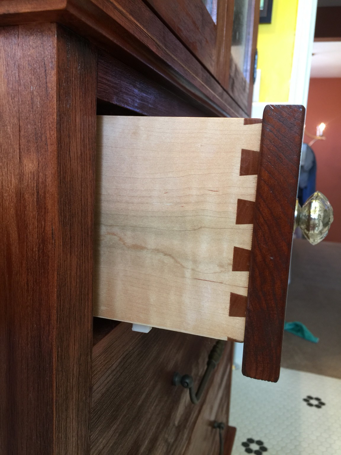 Also notable are the door and drawer faces. The doors are made of book-matched figured cherry and the drawer faces are made of quilted cheery that I had been saving for just the right project. This is also the first time I built dovetail drawers (machine cut, but hey, they’re still dovetails!). This project was also notable because Lynette and I built it together – lot’s of fond memories of building that as she waddled around with Lily in her belly!
