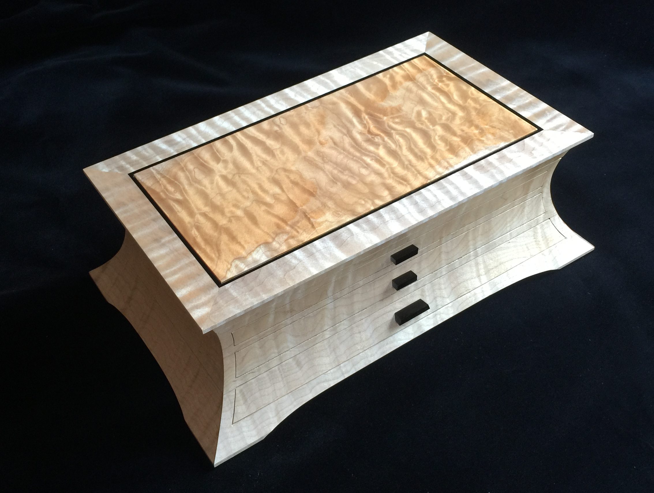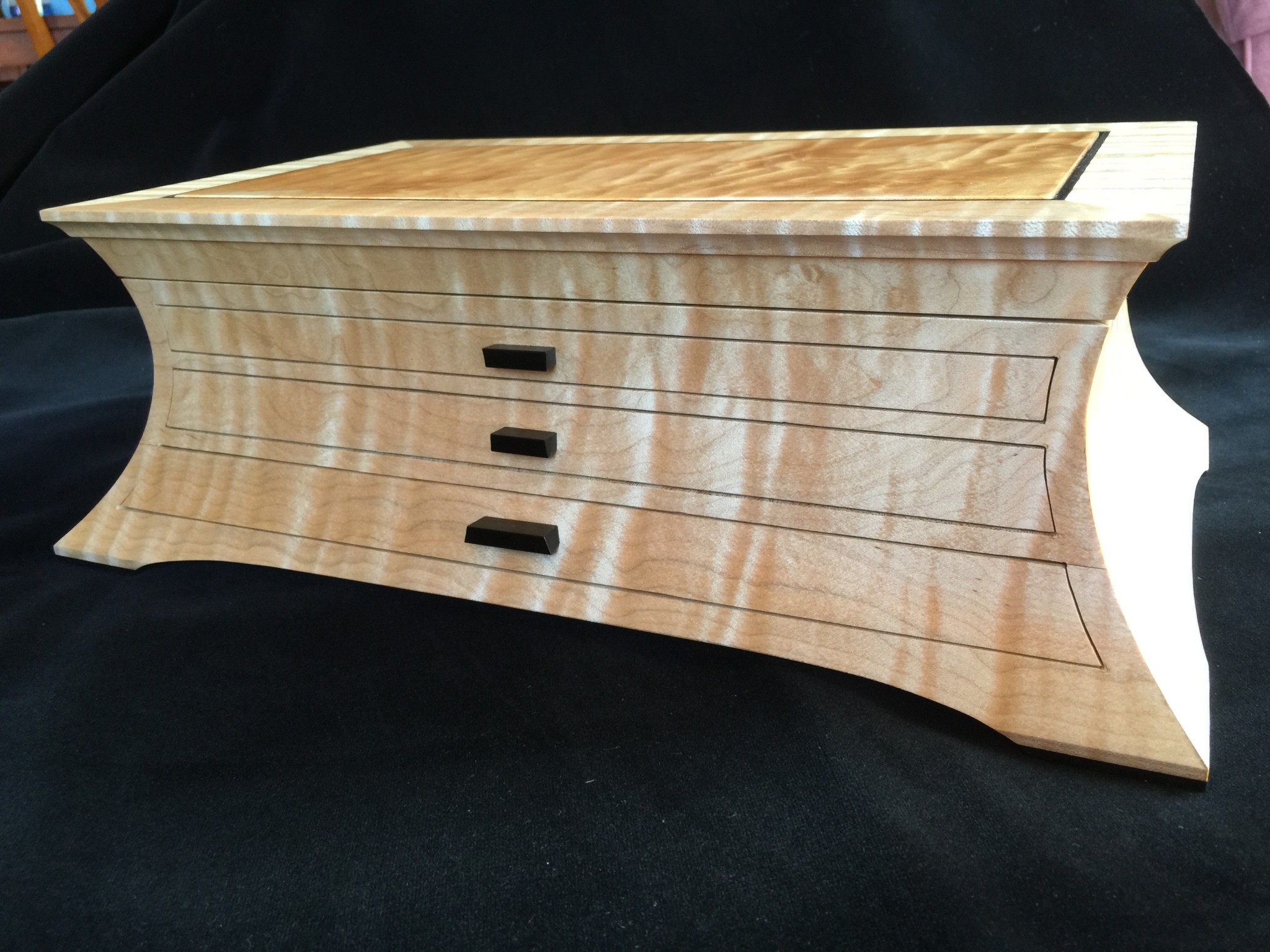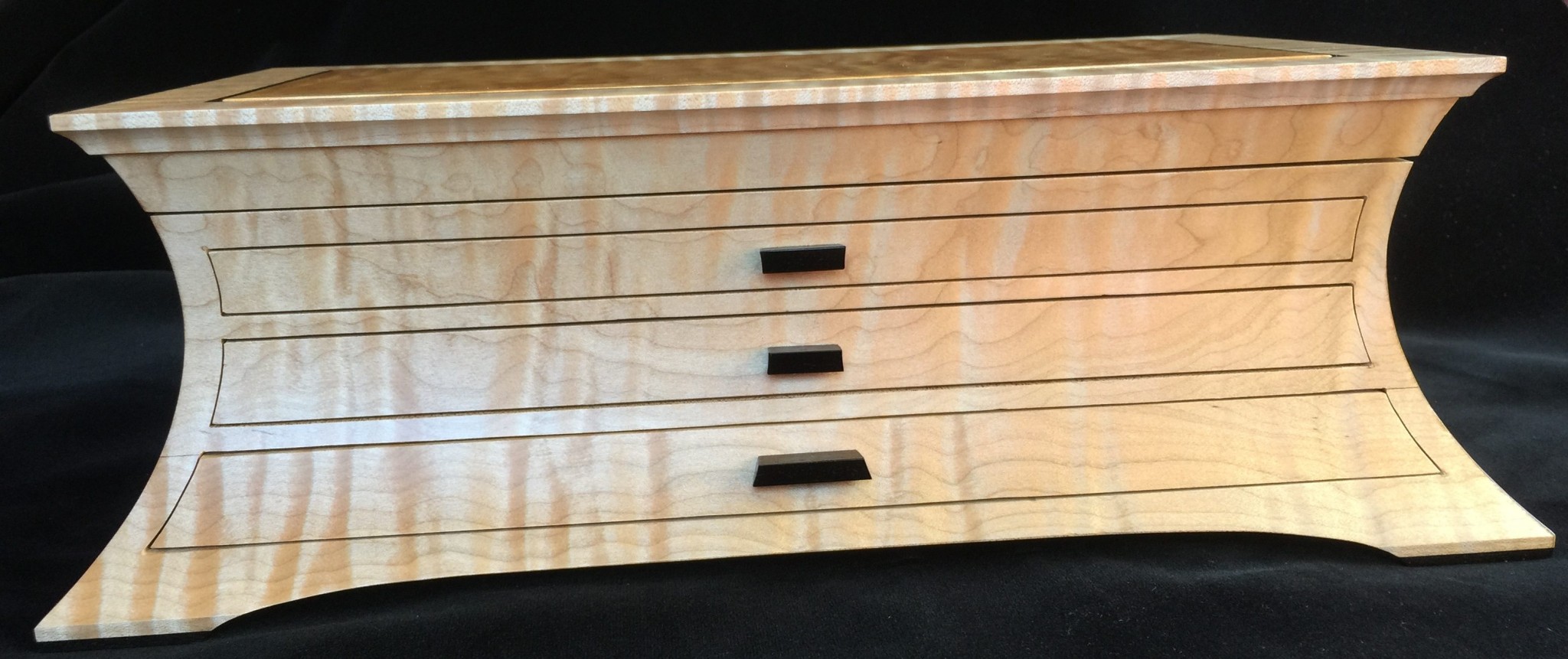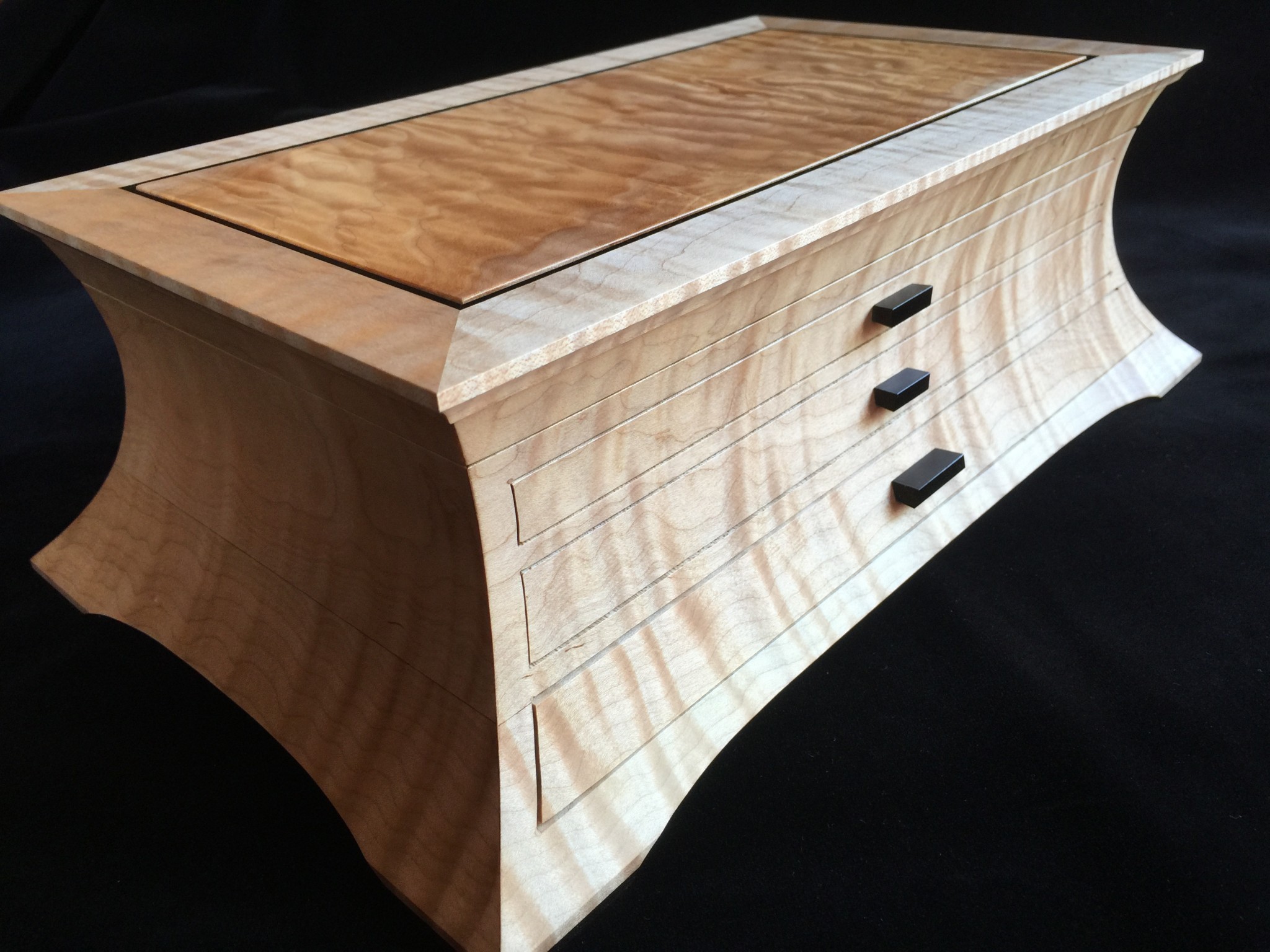About 10 years ago I started a jewelry box project for my wife, and promised it as a gift for an upcoming wedding anniversary. For my woodworking skill level, the project was ambitious in that it involved curved sides and drawers that were scroll-cut from the curved face. Further complicating the project was that it was constructed of 8/4 solid maple, making the scroll saw work challenging. I spent some months working on the project, which I designed on a computer to work out the complex internal jointry, but ultimately missed the anniversary deadline! Over the subsequent years, I worked sporadically on the project and many times offered it up a gift for the next important event. However, ultimately it was put on a shelf due to the demands of family life and my small children. Over the years, I would pull it out, scratch my chin for some time, perhaps make a few cuts and then return it to the cabinet for another day. About a year ago, with my children in their teens and a bit more time on my hands, I decided, in earnest, to finish the project. Indeed, I gave it too my wife this Valentine’s day as a token of our love. The box is made from figured maple with ebony details on the top, pulls and feet. The solid-wood, floating, top panel is figured maple of a different variety and is finished with a high gloss, buffed lacquer finish. The rest of the box is finished in satin lacquer. The draw slides were milled into the solid maple side pieces prior to assembly, and the draws were made of cherry and maple.