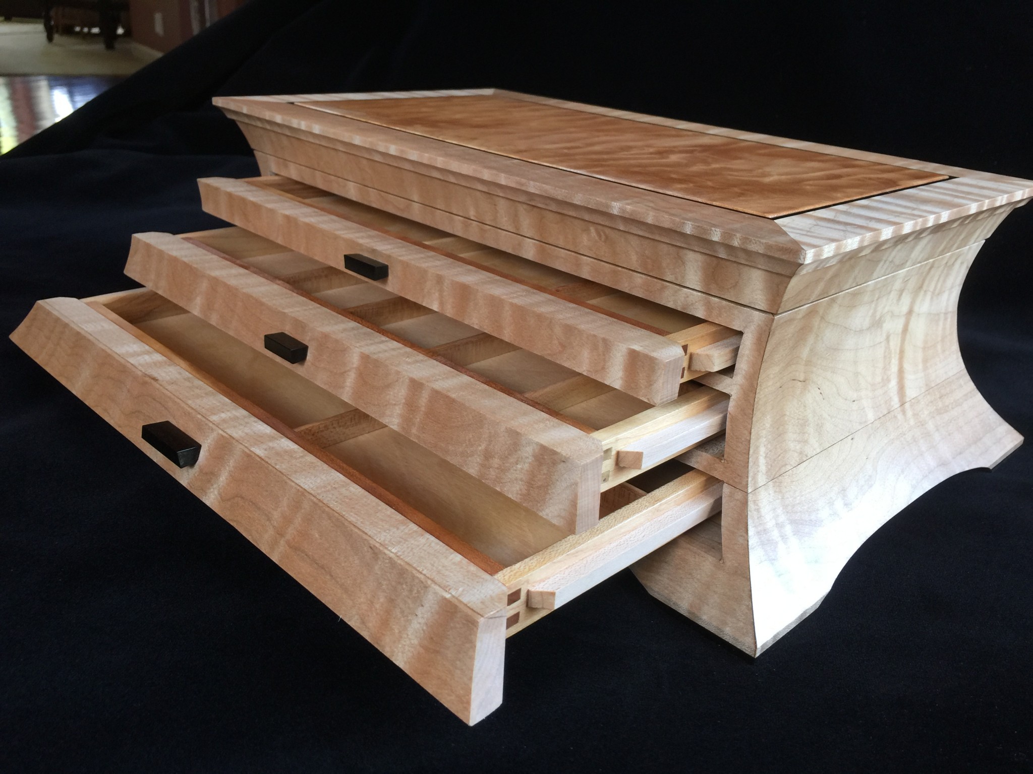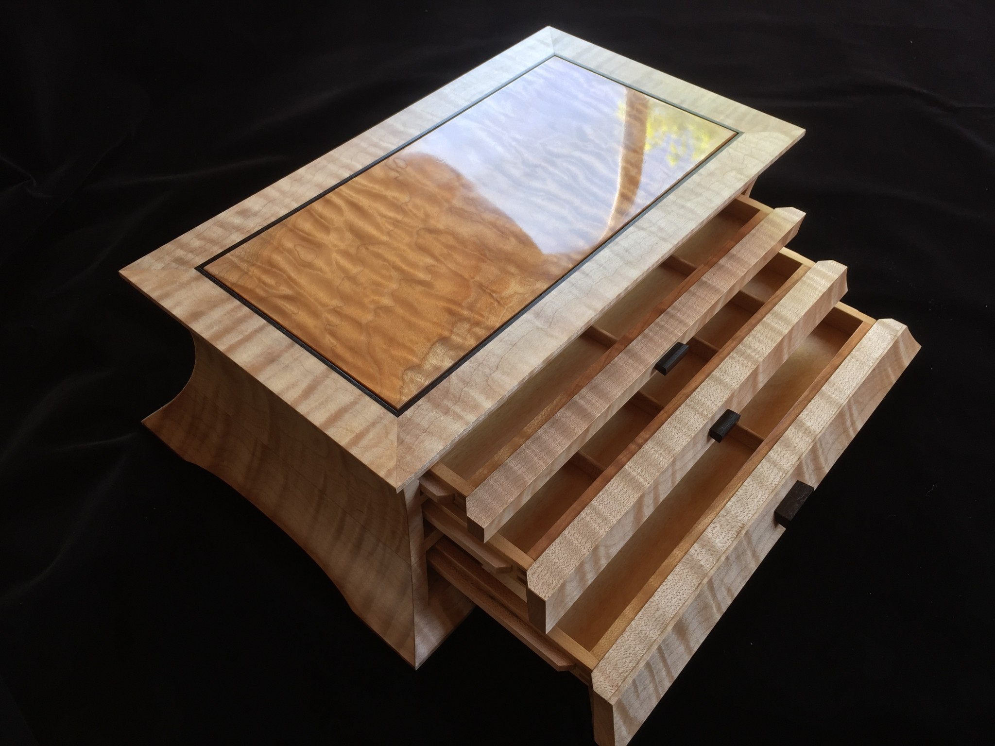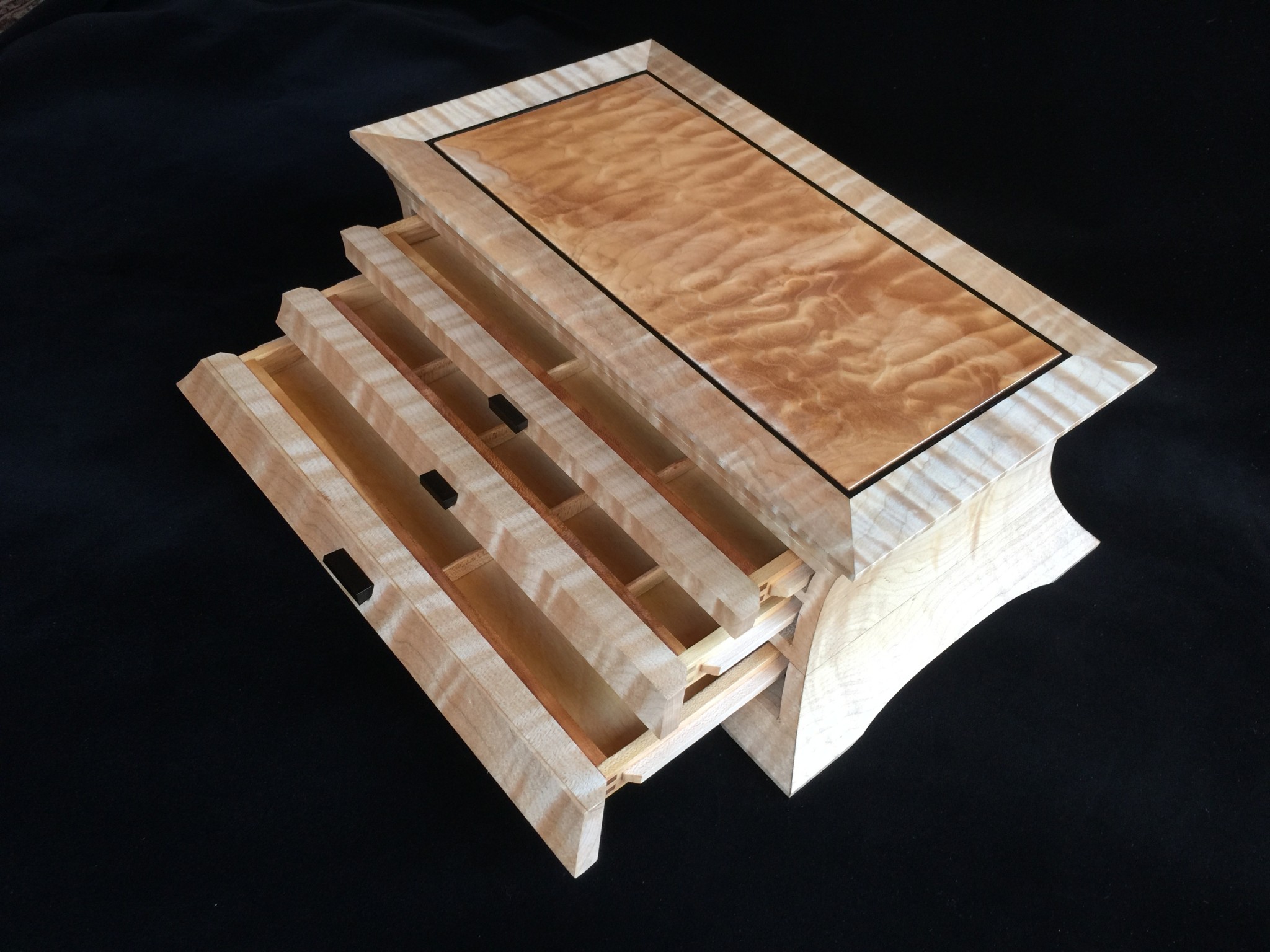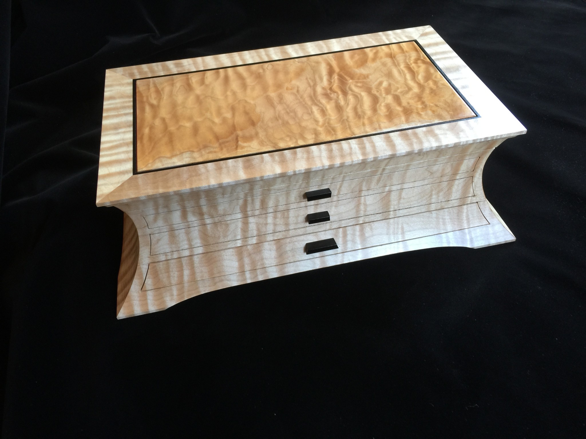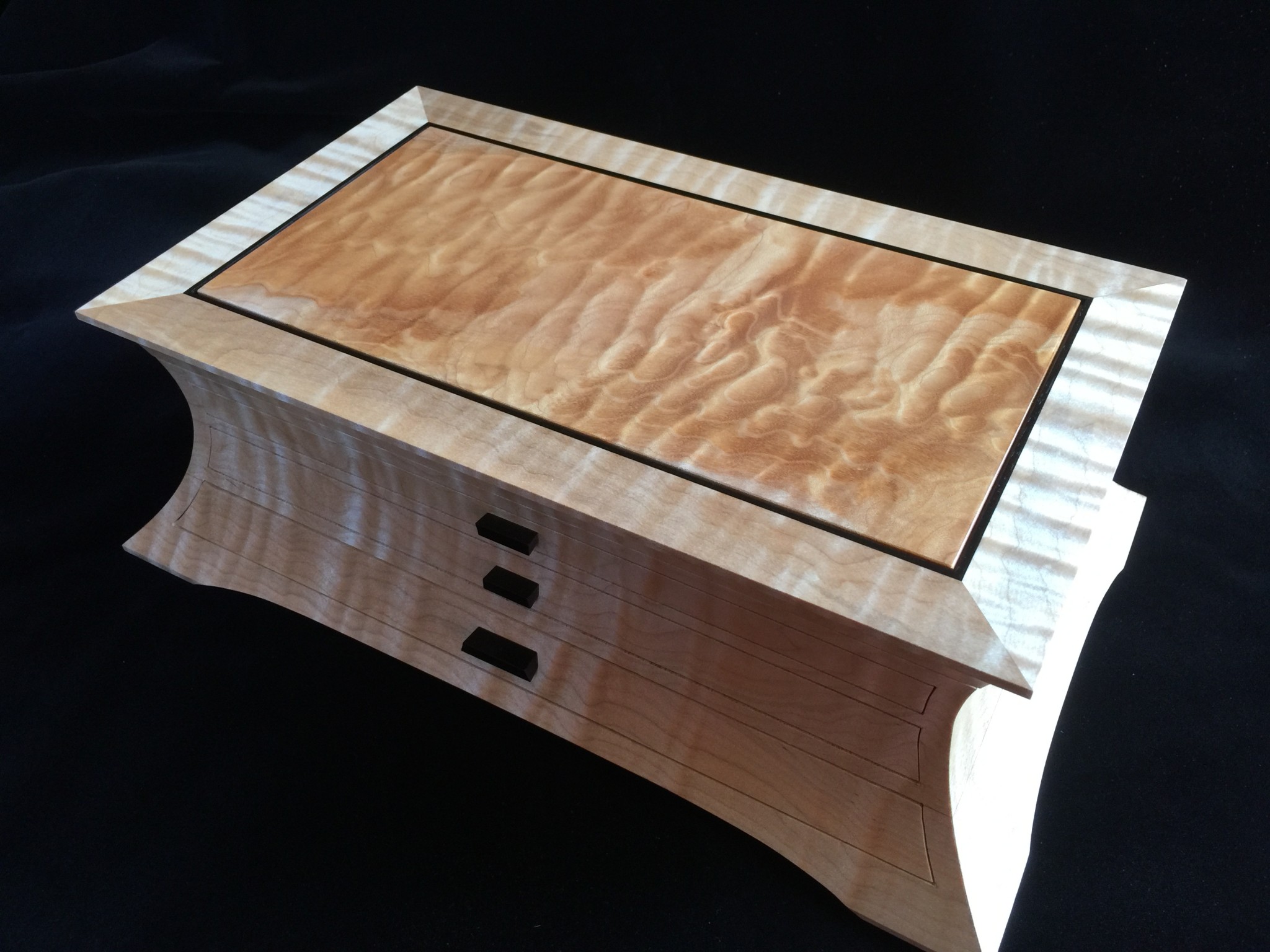 About 10 years ago I started a jewelry box project for my wife, and promised it as a gift for an upcoming wedding anniversary. For my woodworking skill level, the project was ambitious in that it involved curved sides and drawers that were scroll-cut from the curved face. Further complicating the project was that it was constructed of 8/4 solid maple, making the scroll saw work challenging. I spent some months working on the project, which I designed on a computer to work out the complex internal jointry, but ultimately missed the anniversary deadline! Over the subsequent years, I worked sporadically on the project and many times offered it up a gift for the next important event. However, ultimately it was put on a shelf due to the demands of family life and my small children. Over the years, I would pull it out, scratch my chin for some time, perhaps make a few cuts and then return it to the cabinet for another day. About a year ago, with my children in their teens and a bit more time on my hands, I decided, in earnest, to finish the project. Indeed, I gave it too my wife this Valentine’s day as a token of our love. The box is made from figured maple with ebony details on the top, pulls and feet. The solid-wood, floating, top panel is figured maple of a different variety and is finished with a high gloss, buffed lacquer finish. The rest of the box is finished in satin lacquer. The draw slides were milled into the solid maple side pieces prior to assembly, and the draws were made of cherry and maple.