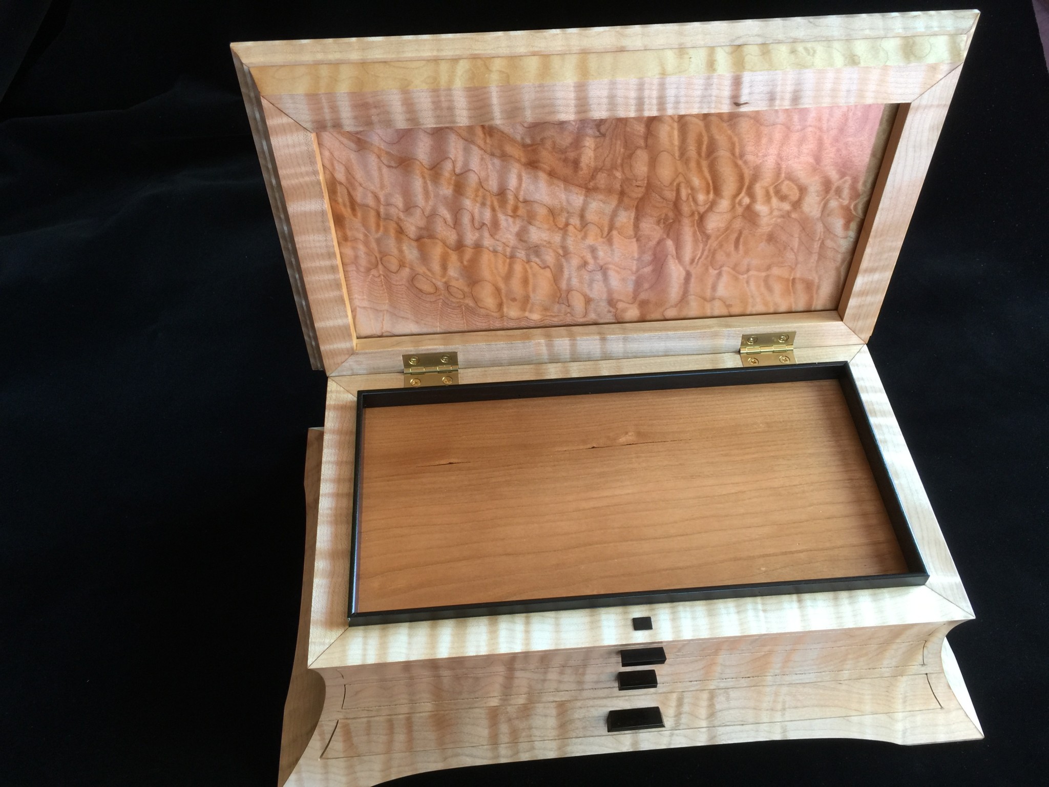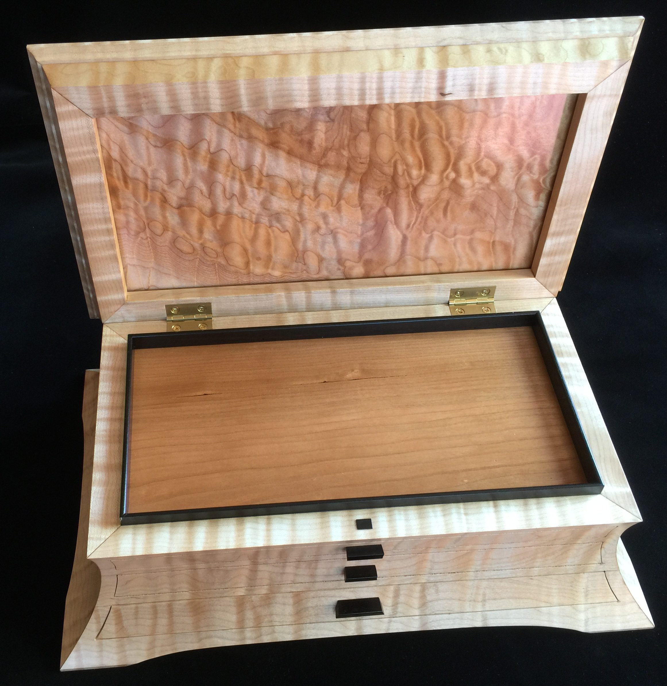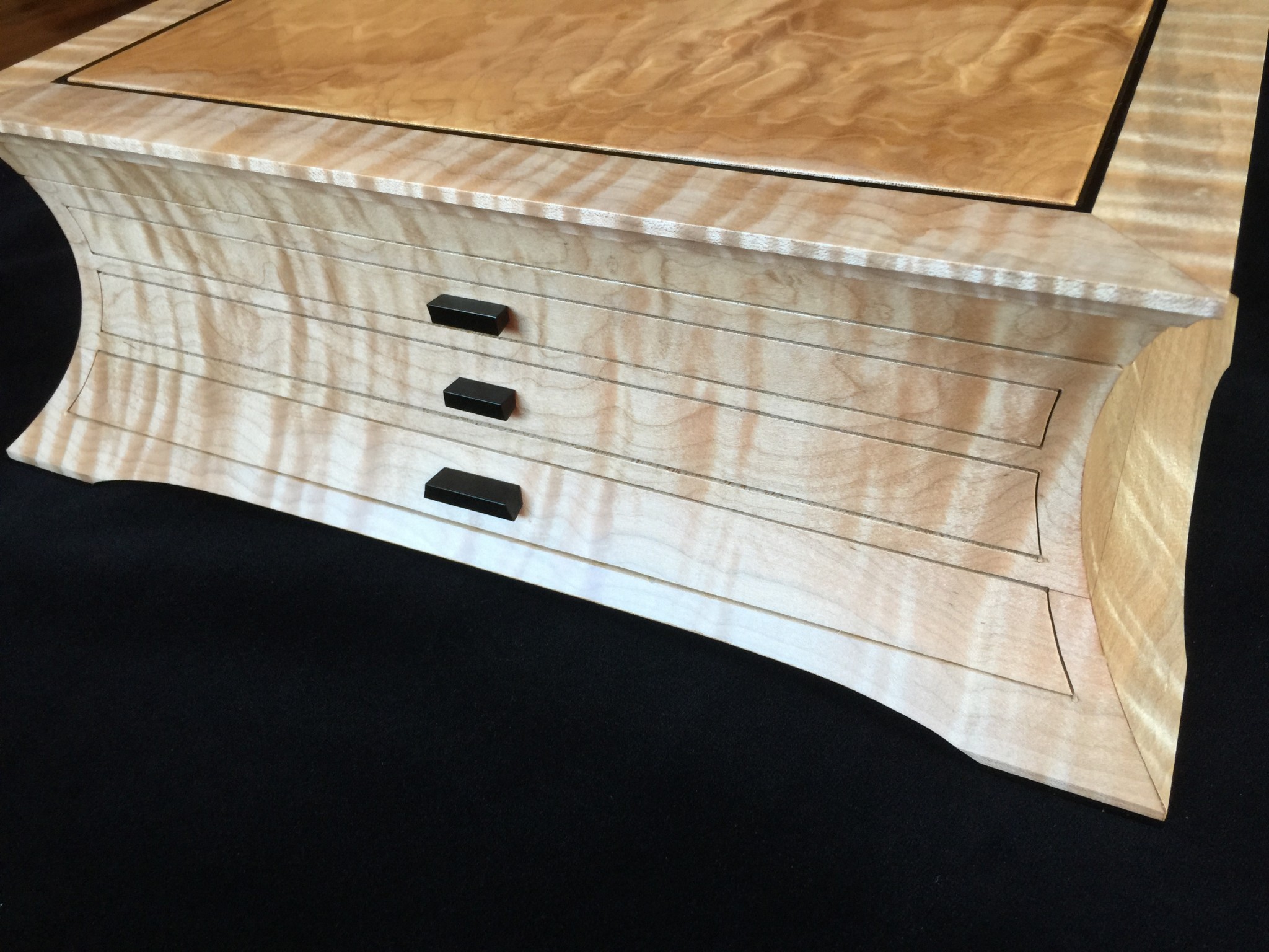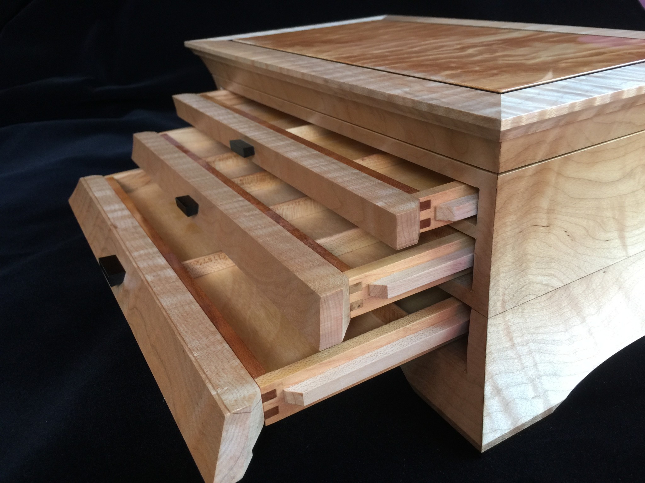 About 10 years ago I started a jewelry box project for my wife, and promised it as a gift for an upcoming wedding anniversary. For my woodworking skill level, the project was ambitious in that it involved curved sides and drawers that were scroll-cut from the curved face. Further complicating the project was that it was constructed of 8/4 solid maple, making the scroll saw work challenging. I spent some months working on the project, which I designed on a computer to work out the complex internal jointry, but ultimately missed the anniversary deadline! Over the subsequent years, I worked sporadically on the project and many times offered it up a gift for the next important event. However, ultimately it was put on a shelf due to the demands of family life and my small children. Over the years, I would pull it out, scratch my chin for some time, perhaps make a few cuts and then return it to the cabinet for another day. About a year ago, with my children in their teens and a bit more time on my hands, I decided, in earnest, to finish the project. Indeed, I gave it too my wife this Valentine’s day as a token of our love. The box is made from figured maple with ebony details on the top, pulls and feet. The solid-wood, floating, top panel is figured maple of a different variety and is finished with a high gloss, buffed lacquer finish. The rest of the box is finished in satin lacquer. The draw slides were milled into the solid maple side pieces prior to assembly, and the draws were made of cherry and maple.