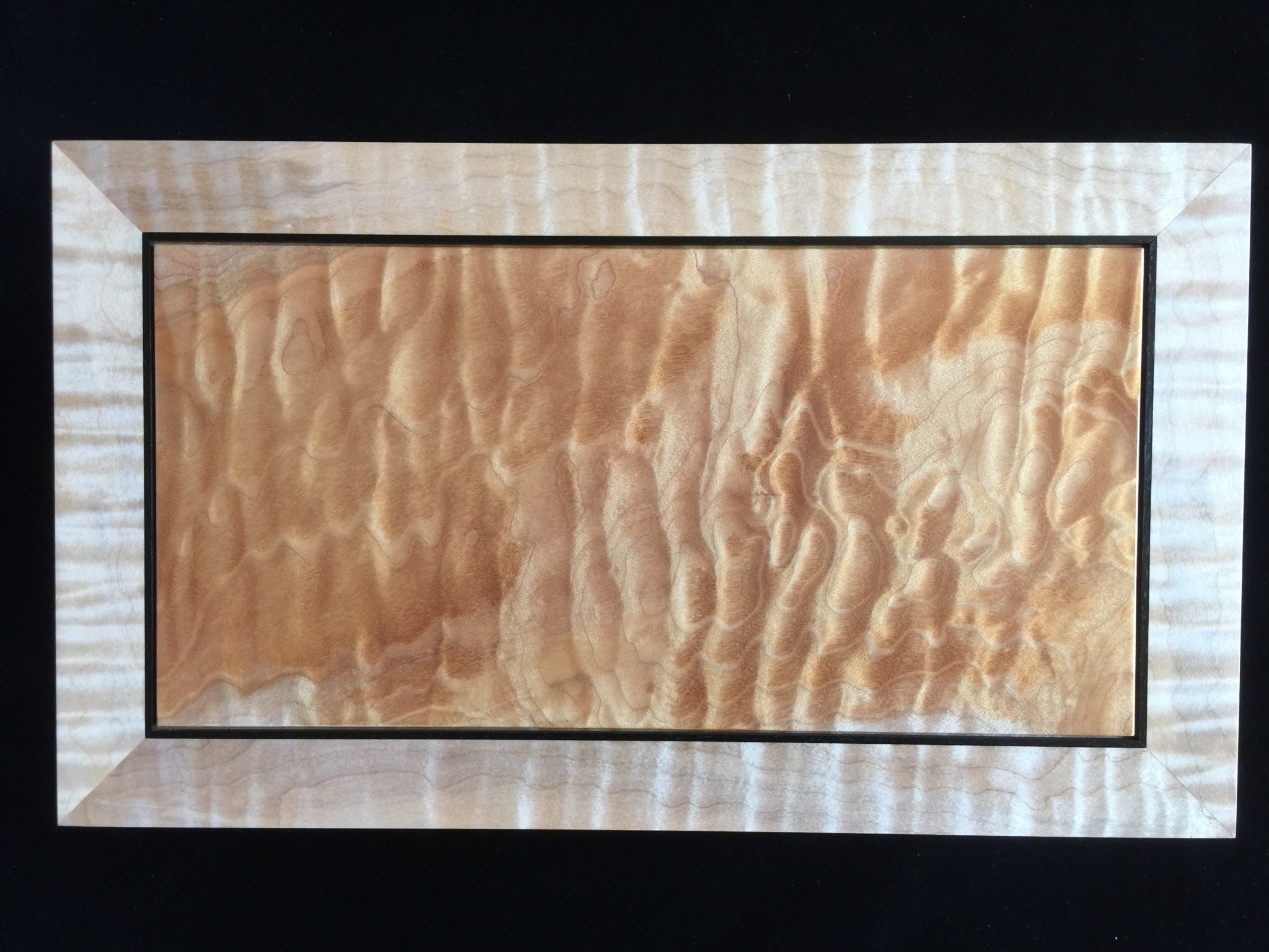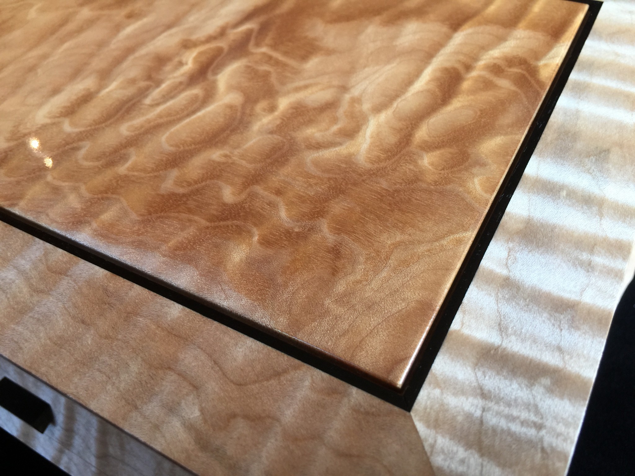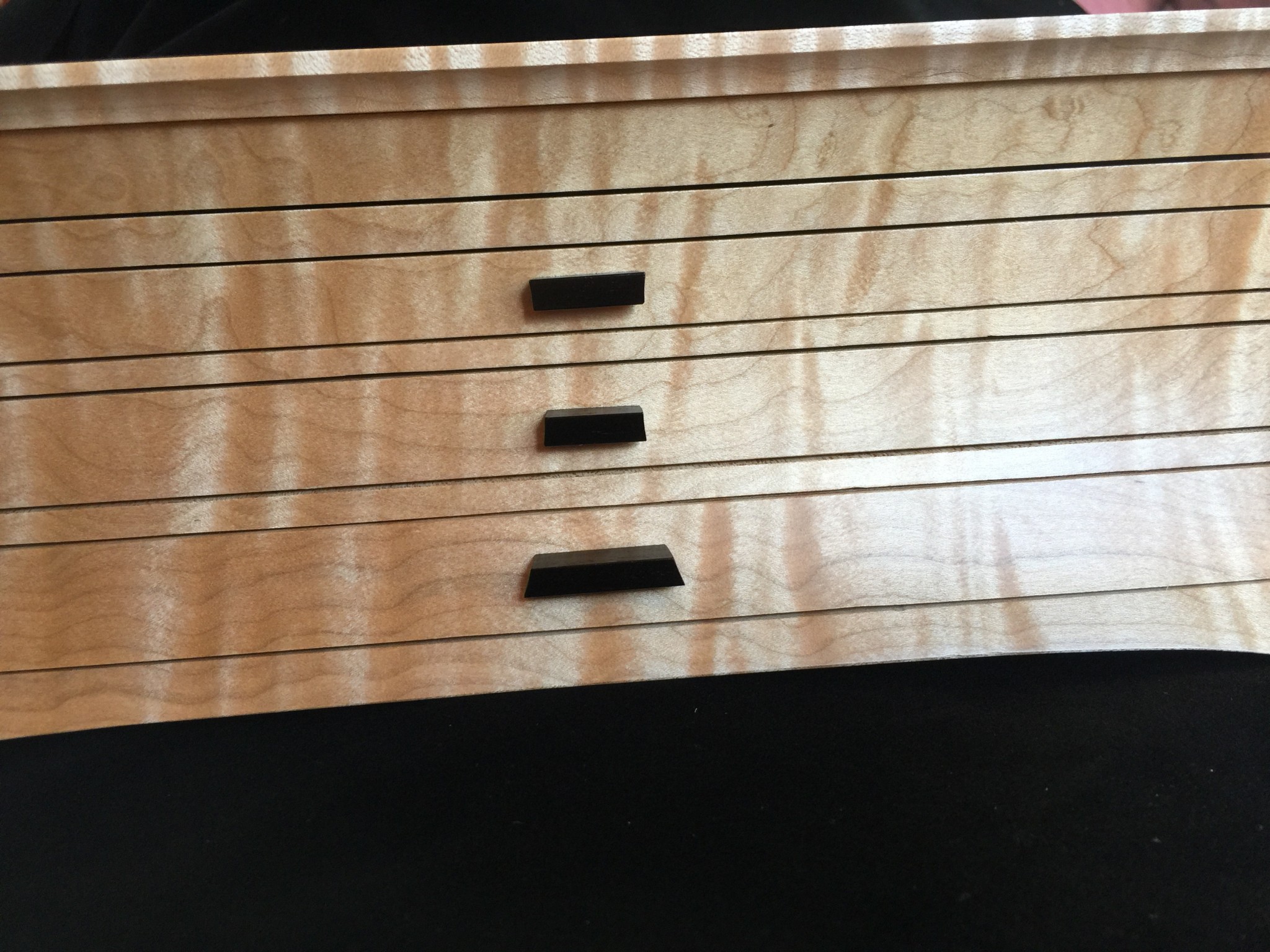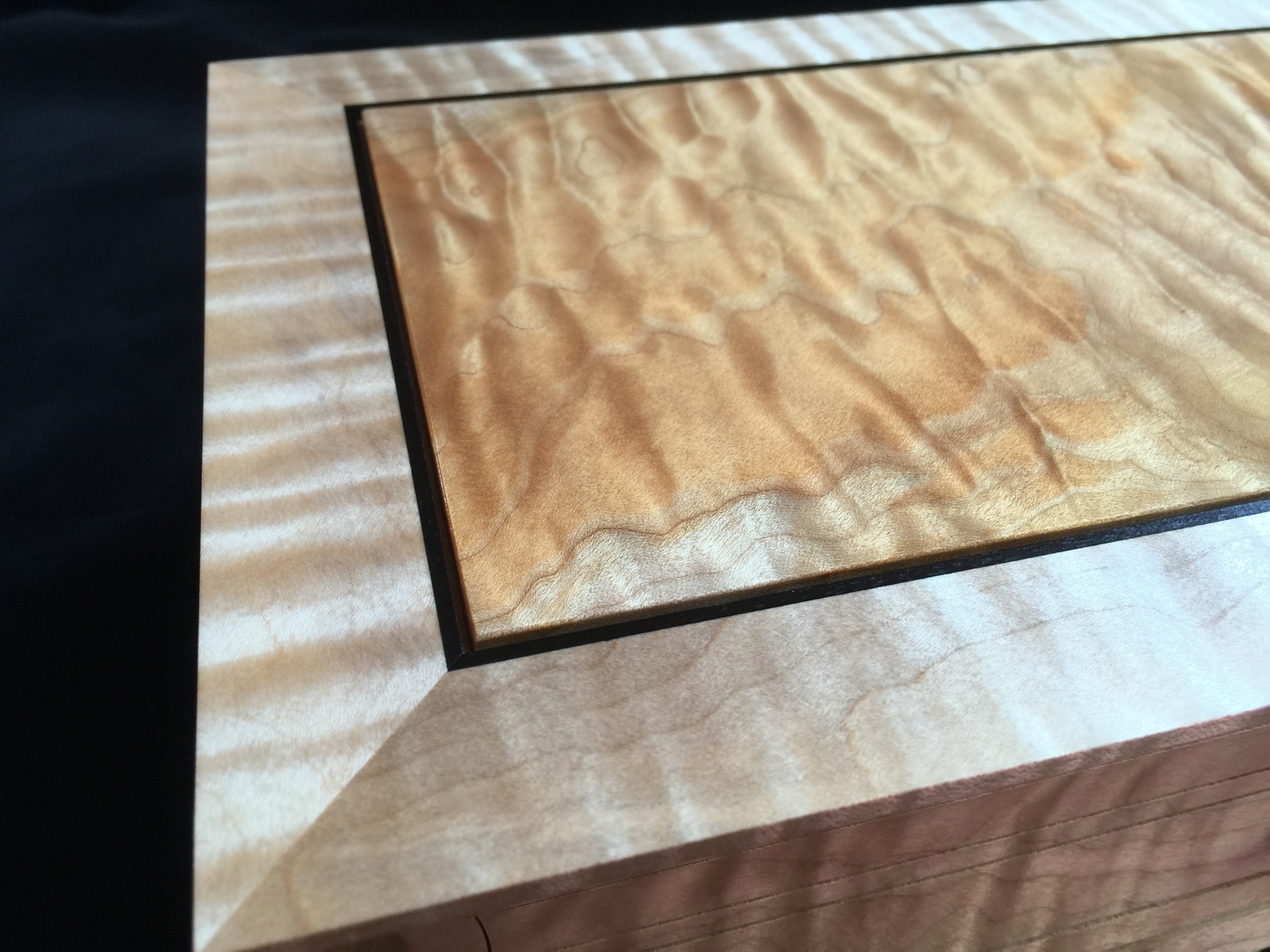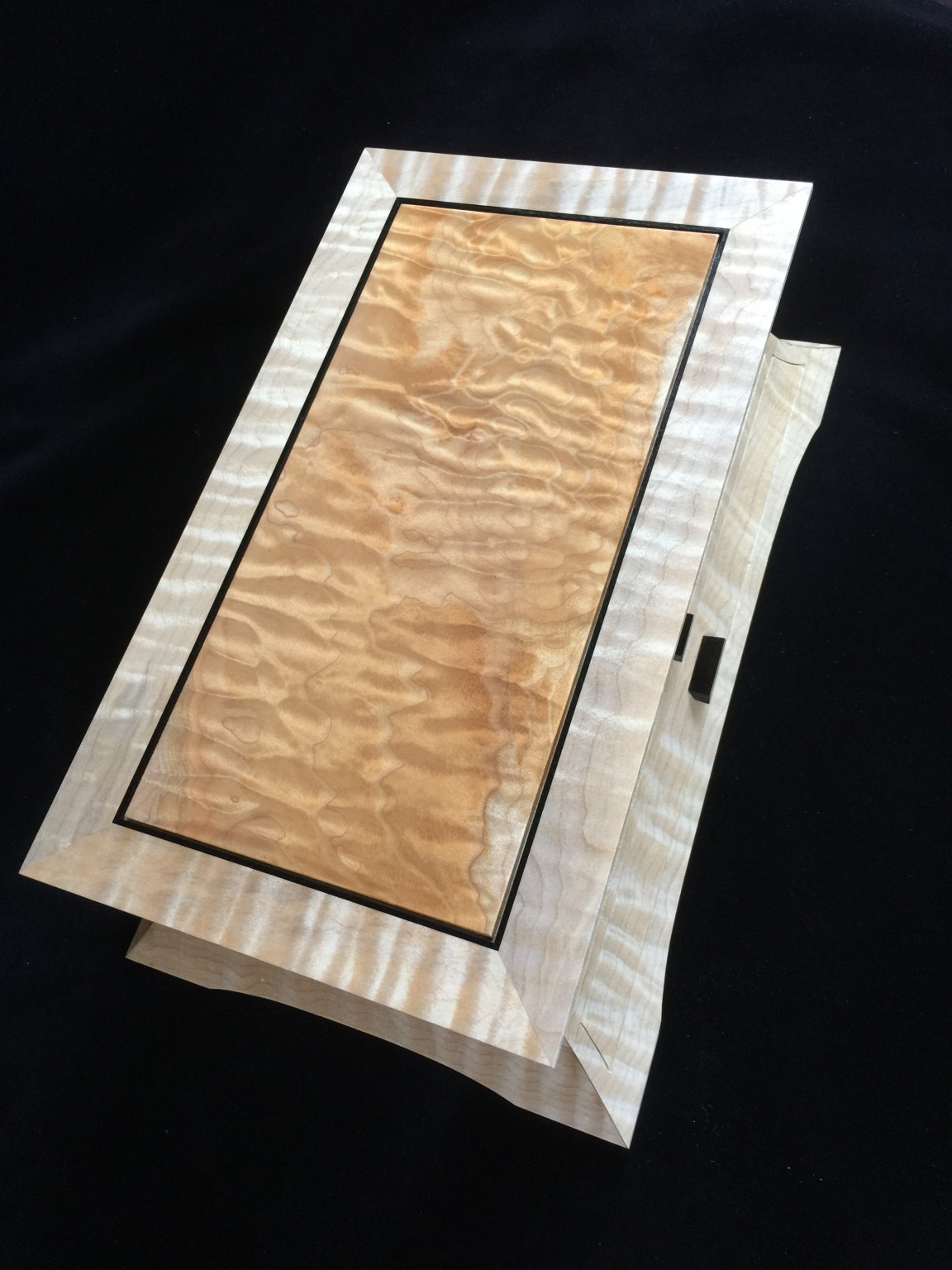 About 10 years ago I started a jewelry box project for my wife, and promised it as a gift for an upcoming wedding anniversary. For my woodworking skill level, the project was ambitious in that it involved curved sides and drawers that were scroll-cut from the curved face. Further complicating the project was that it was constructed of 8/4 solid maple, making the scroll saw work challenging. I spent some months working on the project, which I designed on a computer to work out the complex internal jointry, but ultimately missed the anniversary deadline! Over the subsequent years, I worked sporadically on the project and many times offered it up a gift for the next important event. However, ultimately it was put on a shelf due to the demands of family life and my small children. Over the years, I would pull it out, scratch my chin for some time, perhaps make a few cuts and then return it to the cabinet for another day. About a year ago, with my children in their teens and a bit more time on my hands, I decided, in earnest, to finish the project. Indeed, I gave it too my wife this Valentine’s day as a token of our love. The box is made from figured maple with ebony details on the top, pulls and feet. The solid-wood, floating, top panel is figured maple of a different variety and is finished with a high gloss, buffed lacquer finish. The rest of the box is finished in satin lacquer. The draw slides were milled into the solid maple side pieces prior to assembly, and the draws were made of cherry and maple.
