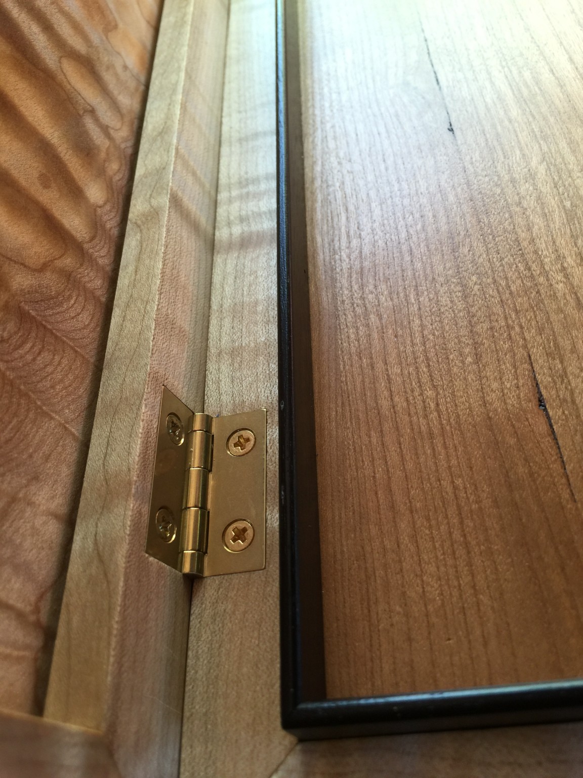 To be honest, I cannot remember exactly when I built this, but I recall having a pretty modest Sears table saw and some pretty rudimentary tools. This piece was made from some Cocobolo that I got from my bud, Kevin. (Actually, a lot of the the wood I have I got from Kevin, who is something of a wood hoarder!) The box has basic finger joints at the corners and is lined with Spanish Cedar. It may be hard to see from the photos, but there is 1/8 inch brass inlay in the top that I epoxied in. The brass started out really shiny, but despite the lacquer finish, it has tarnished over the years. The top was a bit tricky to make because it is not a floating panel. Rather, I epoxied thin slices of book-matched Cocobolo to a 1/4 inch substrate. Then I very carefully planed and sanded the surface until the Cocobolo was basically veneer. This allowed me to securely glue the mitered frame pieces in without worrying about expansion. The top was pretty cool, because I kept the yellow sapwood to form an interesting vase shape in the top. I finished the top with ten-ish coats of lacquer and then wet sanded to get a high gloss finish.