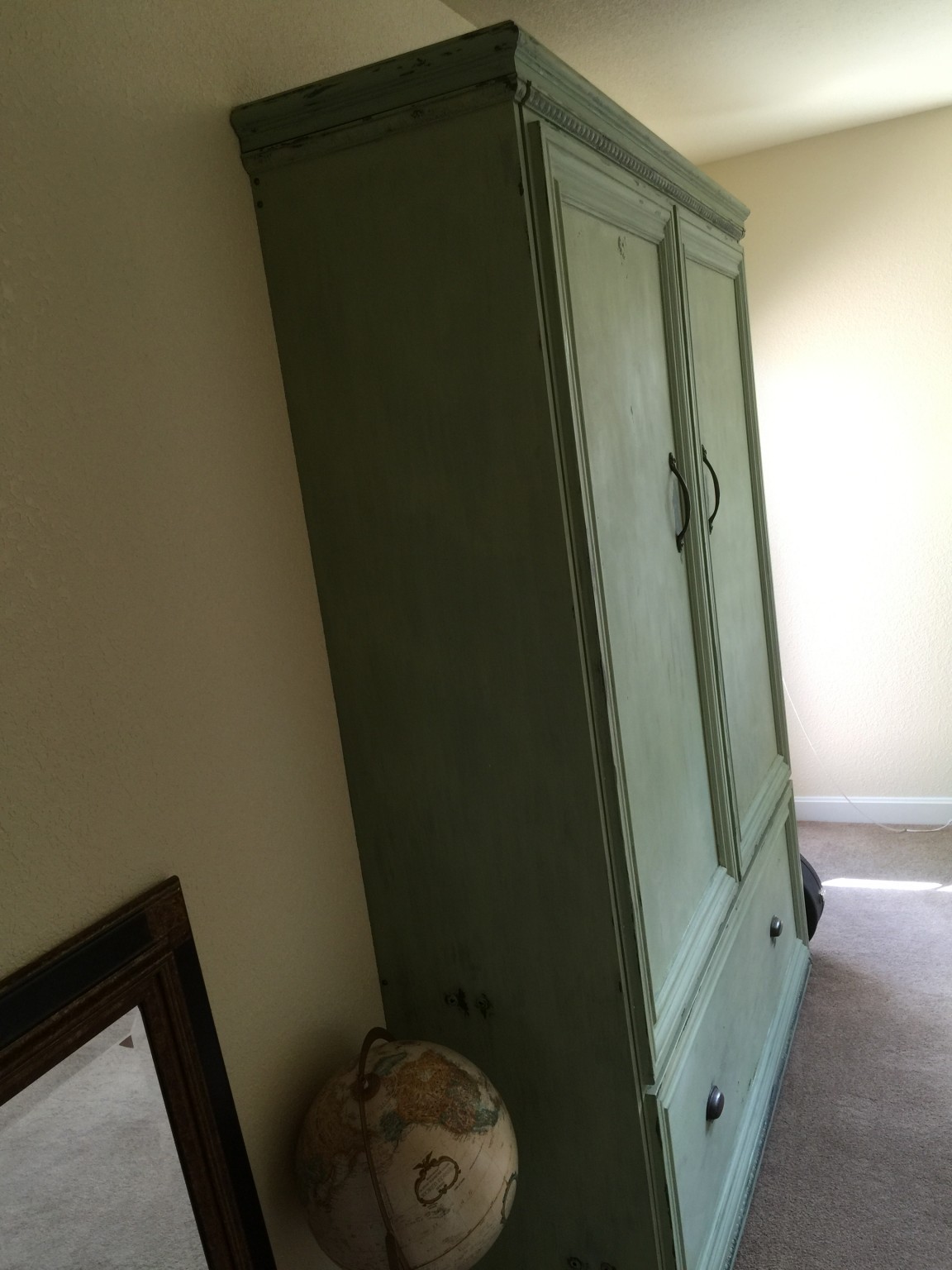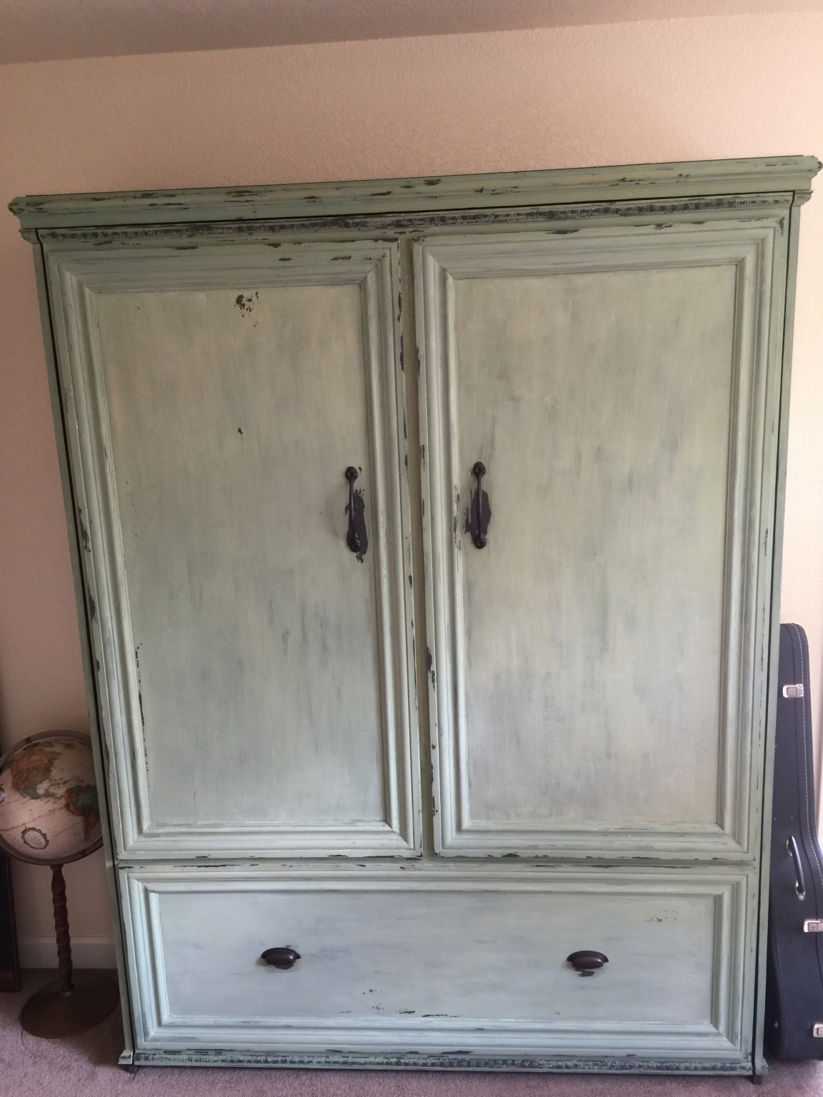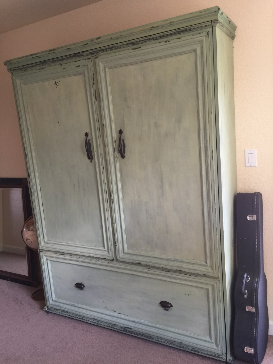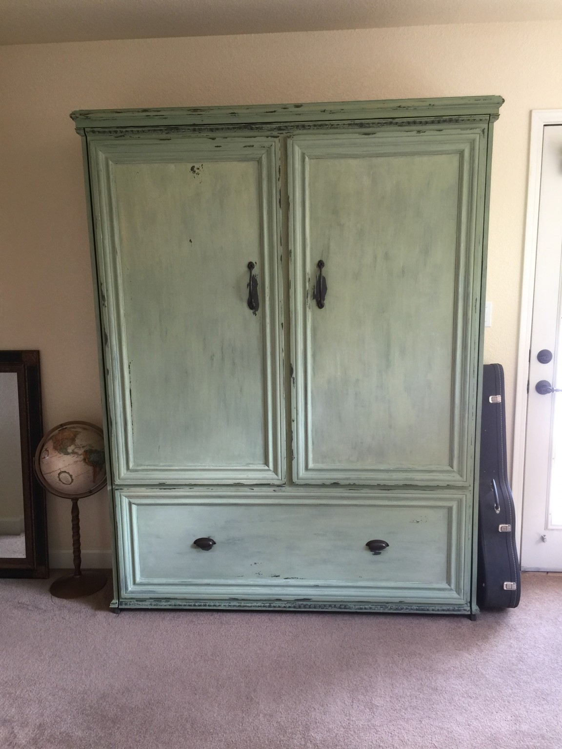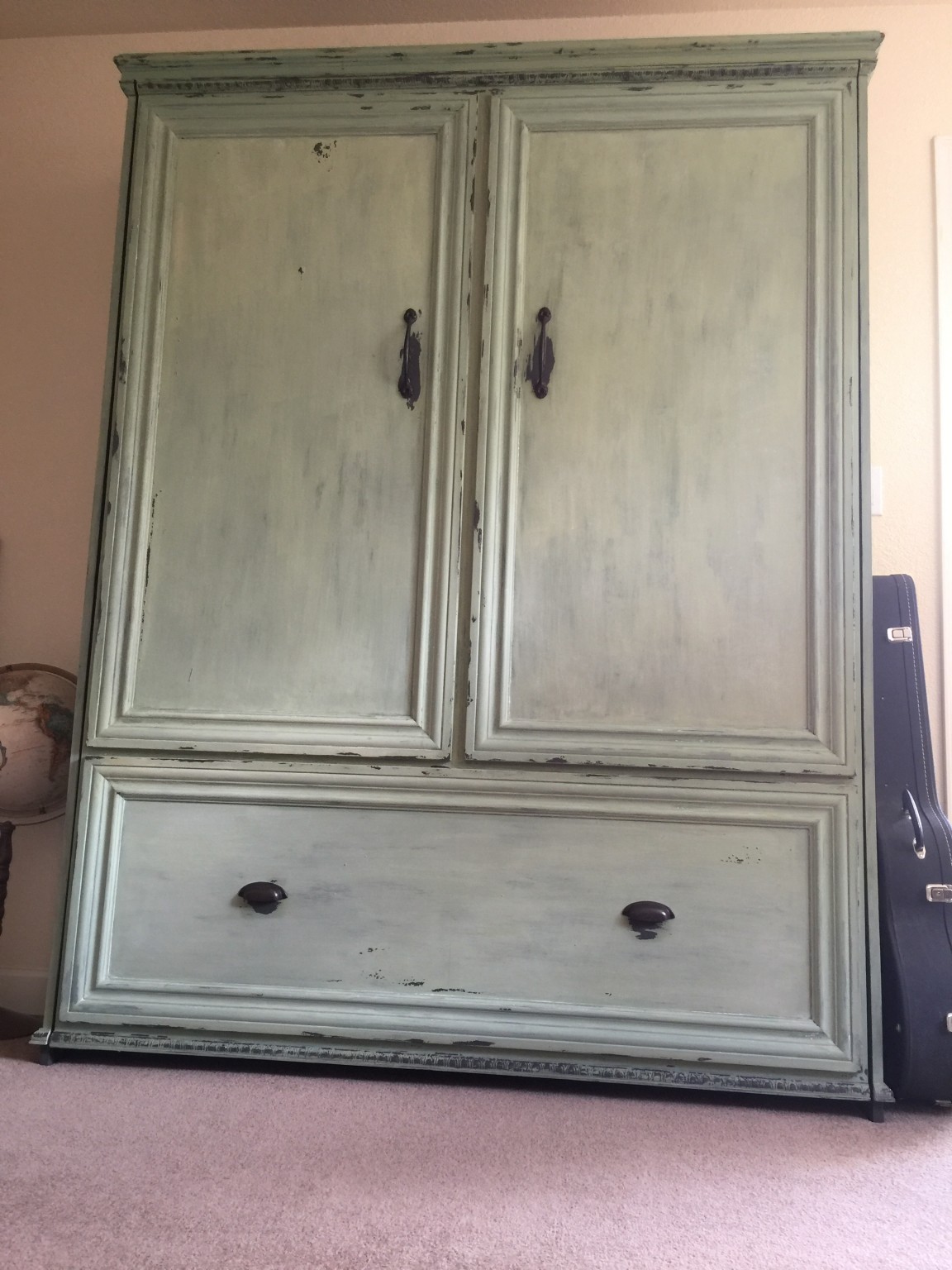 This is a project that mama wanted for our office. When we have guests, they were stuck on one of those inflatable mattresses that feel OK when you first lie down, but then you wake up with a back-ache. Truth be told, this was not fine woodworking – I basically bought a hardware kit from Easy DIY Murphy Bed and followed the instructions, which are well thought-out and comprehensive. The basic bed looks like a really boring box on the wall, so we sexed it up by adding baseboard molding to make some faux doors and a drawer. The best part was the finish that Lynette put on, which is green milk paint. She first painted with a dark grey color, and then covered with milk paint. The bed was pretty plain before she put this sweet finish on it.