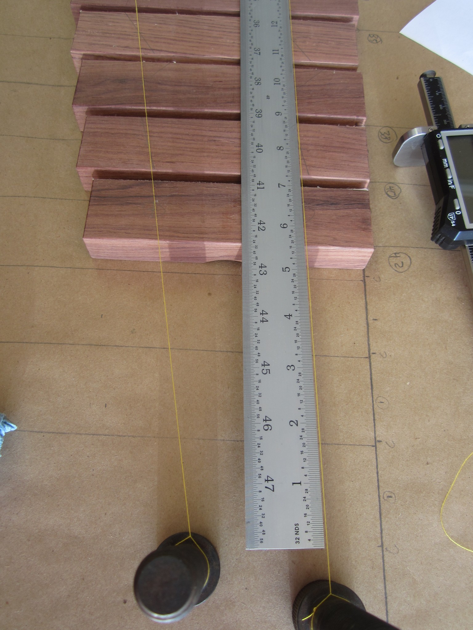 Jack and I started marking all of the computed node offsets on each bar, but this got pretty tedious. In the end, we laid them out carefully on a piece of craft paper that had markings for the horizontal locations and then empirically adjusted the bars to get the best fit to a straight line. Here are a bunch of photos showing the layout and alignment to the penciled node locations:
