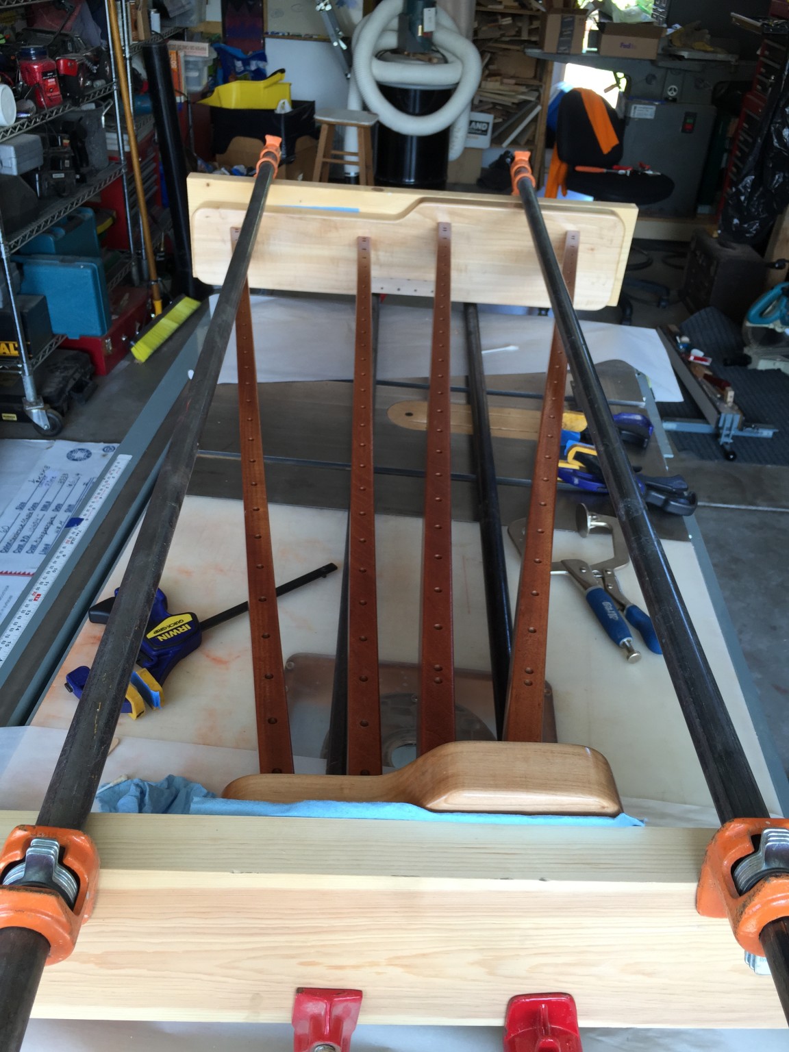 After the finish dried, we glued and clamped the frame assembly. This was a bit “butt puckering” because it is a tricky to get the tenons simultaneously inserted in to the mortises before the glue dries, especially in arid New Mexico where the humidity is so low. Here are few photos of the glue-up: