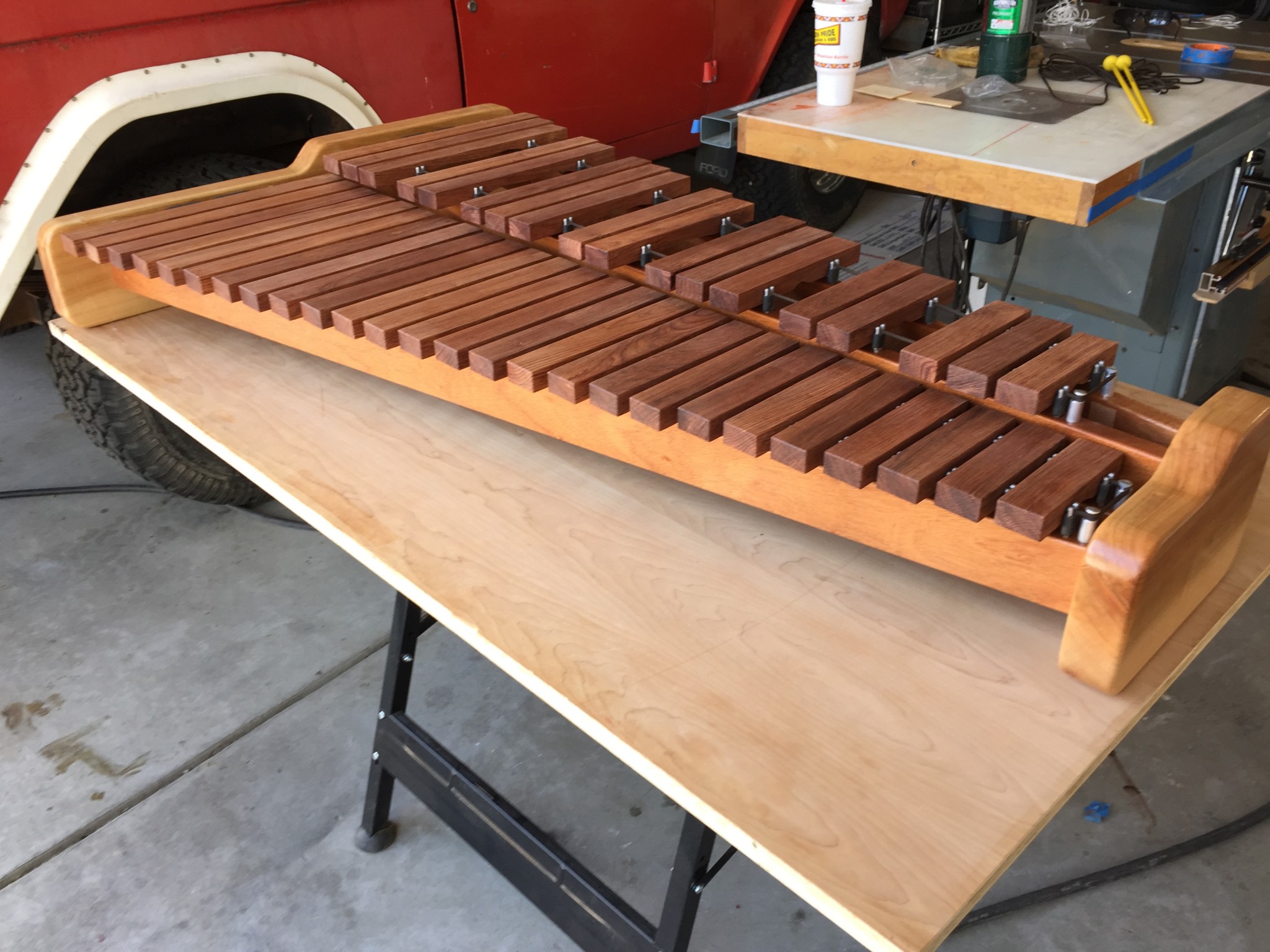 And then came the moment of truth – Jack and I strung the xylophone bars on some brown para-cord, attached the springs, and hung the bars. Pretty cool – we now had a fully functional instrument, minus legs and resonator tubes. Here are some photos of the finished product: